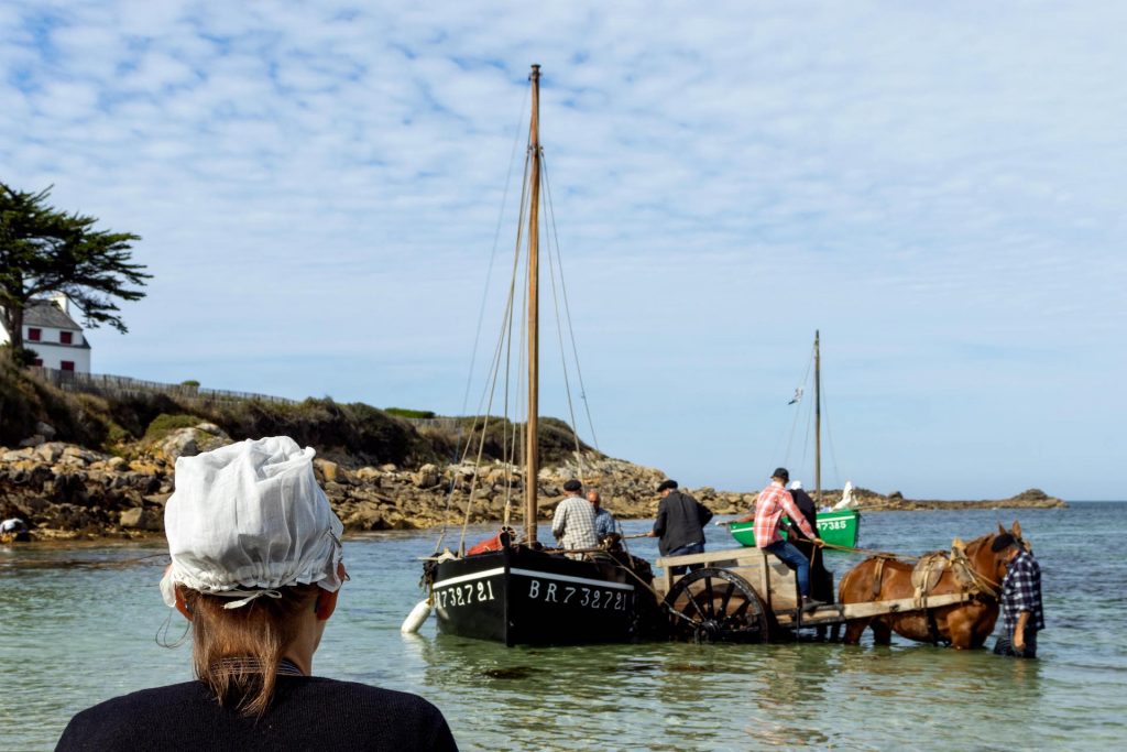 Je me lance alors sur la route des goémoniers d’antan, pour comprendre leur métier, à la fois marin et paysan, ses outils et ses gestuelles. Les algues, coupées à la faucille, sont chargée dans la charrette tractée par un cheval de trait jusqu’à la grève. Le goémon y est alors séché puis transporté sur des civières jusqu’au four creusé à même le sol pour être brûlé et produire de la soude.
