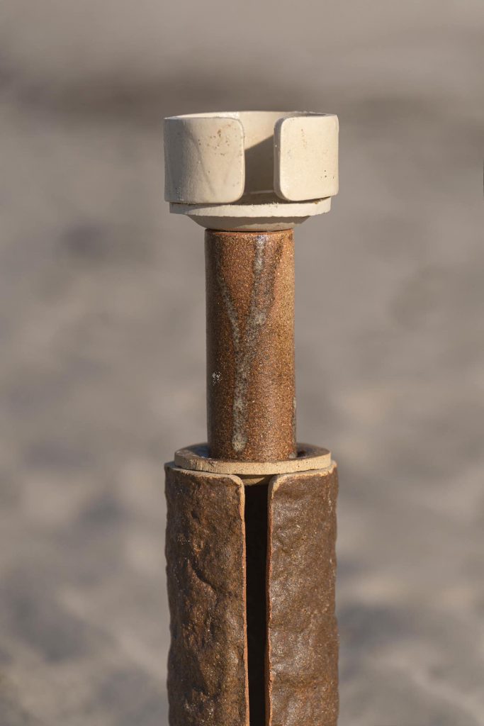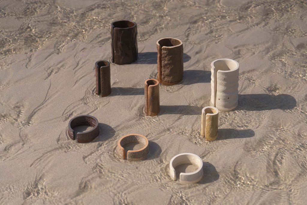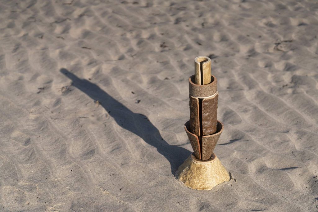 Arrachées à la mer, les algues devenues cendres, viennent habiller un paysage recomposé. J’immortalise dans le plâtre les motifs éphémères des vagues dans le sable, les ondulations des dunes battues par les embruns et les textures du granite bordant les fours que j’estampe dans le grès. Des gammes de reliefs et de couleurs émergent de la juxtaposition de ces volumes qui deviennent les vestiges matériels d’un rituel immatériel.
