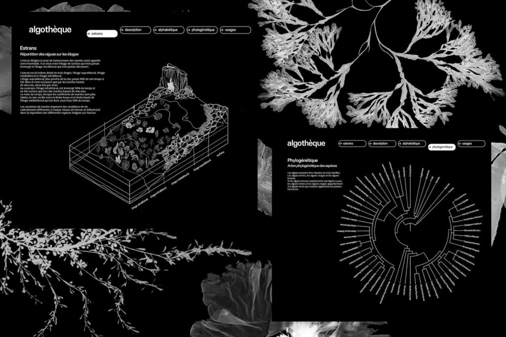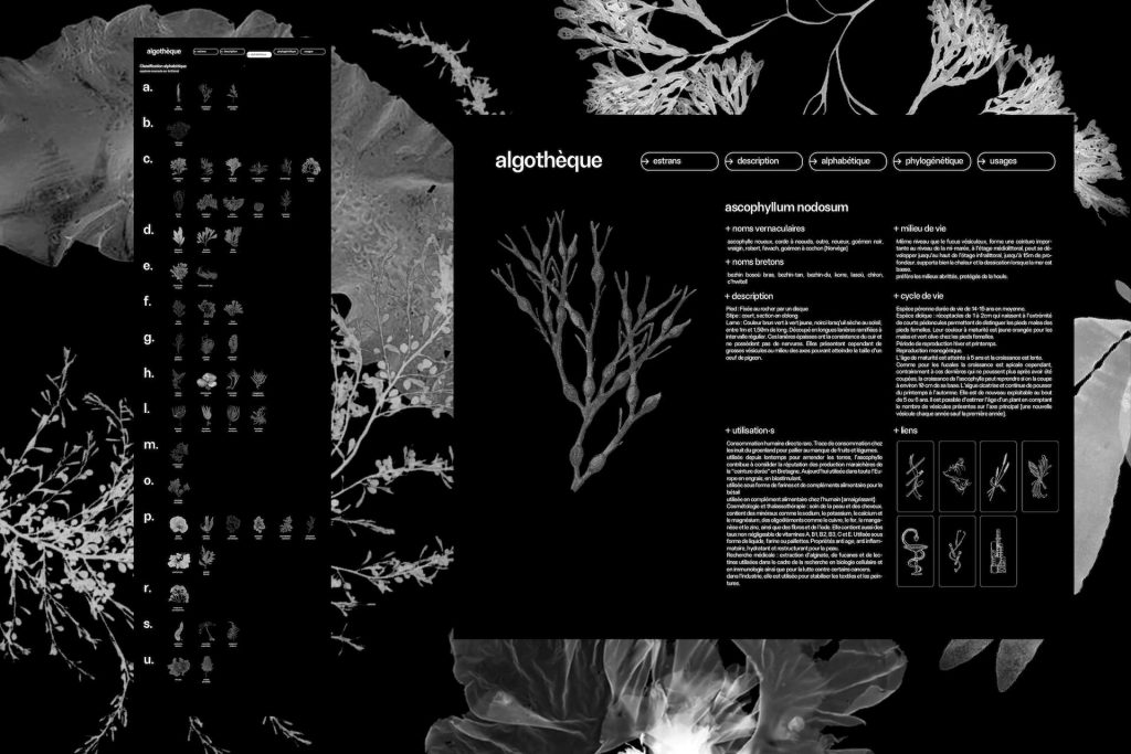 L’algothèque est un outil produit en réponse à ce besoin d’organiser et de trier l’information selon le centre d’intérêt du visiteur. À partir d’une base de donnée d’une cinquantaine d’espèces recensées, cette plateforme permet de regrouper les algues selon des critères génétiques, écologiques ou encore économiques.